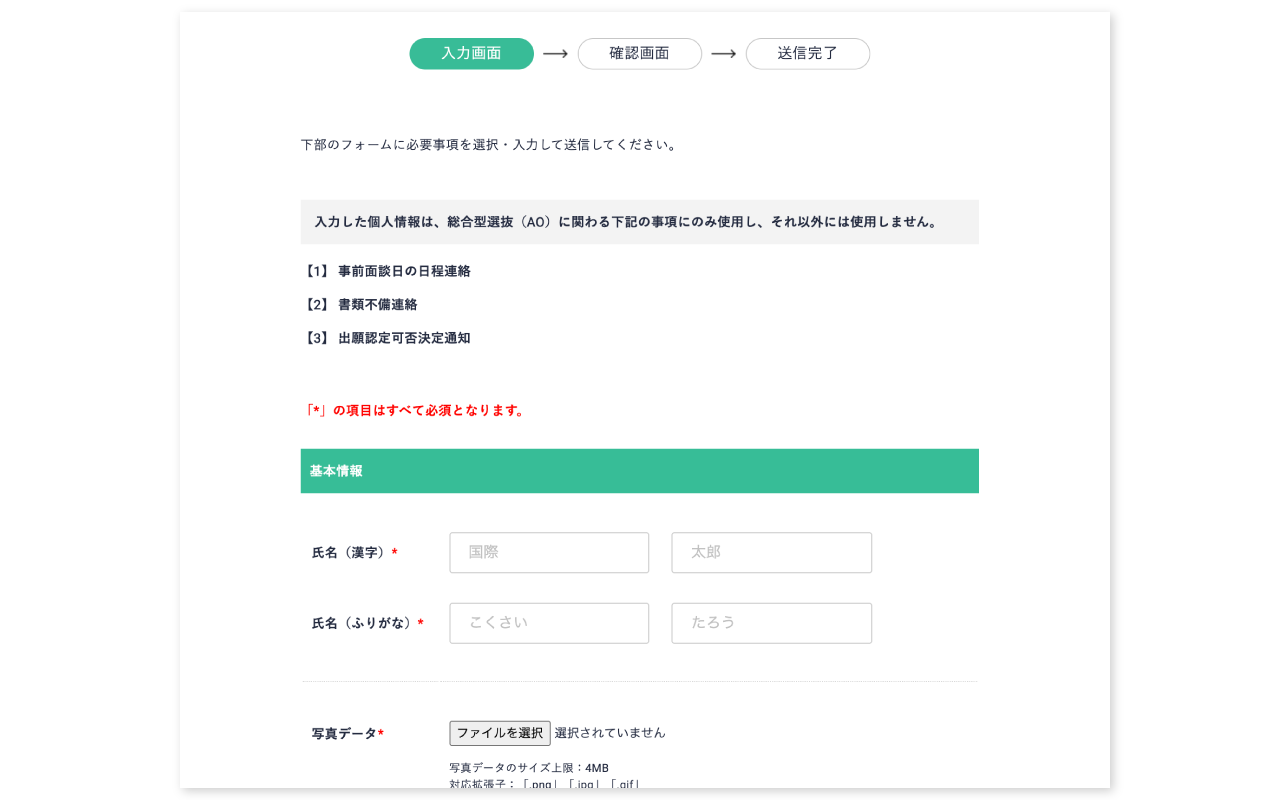 プレゼン、課題、資格・活動実績など選択した方式について入力。